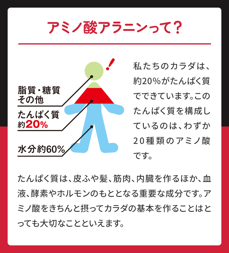 私たちのカラダは、約20%がたんぱく質でできています。このたんぱく質を構成しているのは、わずか20種類のアミノ酸です。 たんぱく質は、皮ふや髪、筋肉、内臓を作るほか、血液、酵素やホルモンのもととなる重要な成分です。アミノ酸をきちんと摂ってカラダの基本を作ることはとっても大切なことといえます。