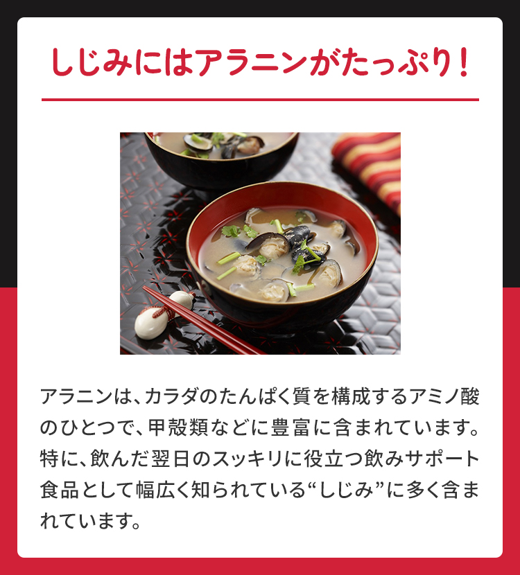 アラニンは、カラダのたんぱく質を構成するアミノ酸のひとつで、甲殻類などに豊富に含まれています。特に、飲んだ翌日のスッキリに役立つ飲みサポート食品として幅広く知られている“しじみ”に多く含まれています。
