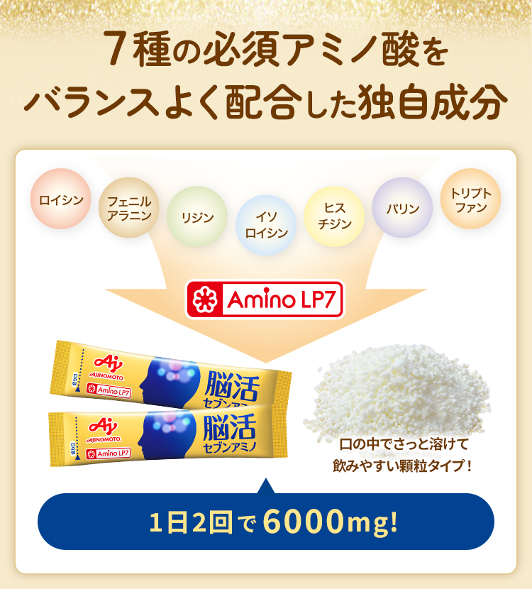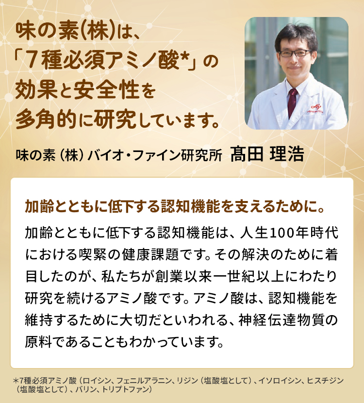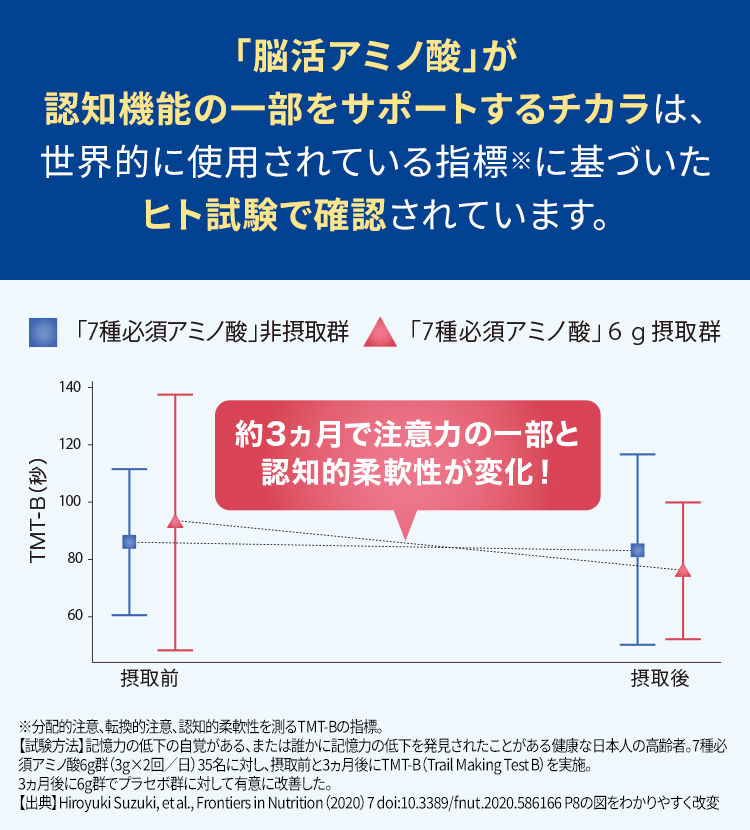 【試験方法】記憶力の低下の自覚がある、または誰かに記憶力の低下を発見されたことがある健康な日本人の高齢者。7種必須アミノ酸6g群(3g×2回/日)35名に対し、摂取前と3ヵ月後にTMT-B(Trail