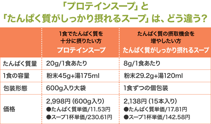 ※ですが、プロテインスープは目安量で1食あたり20g摂取できますので、1日3回で推奨量をカバーすることが可能です。1食ずつの個包装ではなく大袋入りですので、その時々に応じて摂取量も調整しやすいという点もご好評をいただいています。