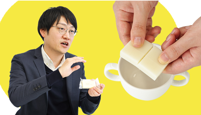 河東:既存のフリーズドライスープに炭水化物を合わせようと考え、さまざまなご家庭に春雨、麺、もちを試食してもらったら、「おもちってこんな食べ方があるんだ!」「噛みごたえがいい」「腹持ちが良い」とおもちが大好評。子どもが作ることも想定し、熱湯を使わず水から電子レンジでチンする方法を模索しました。結果、40gのおもちにスリットを十字に入れると、水分がうまく浸透するし、絶妙な食感も引き出せたんです。改めてもちのポテンシャルに気づかされました。あ、スリットのところで小さく割ることもできるんですよ!
