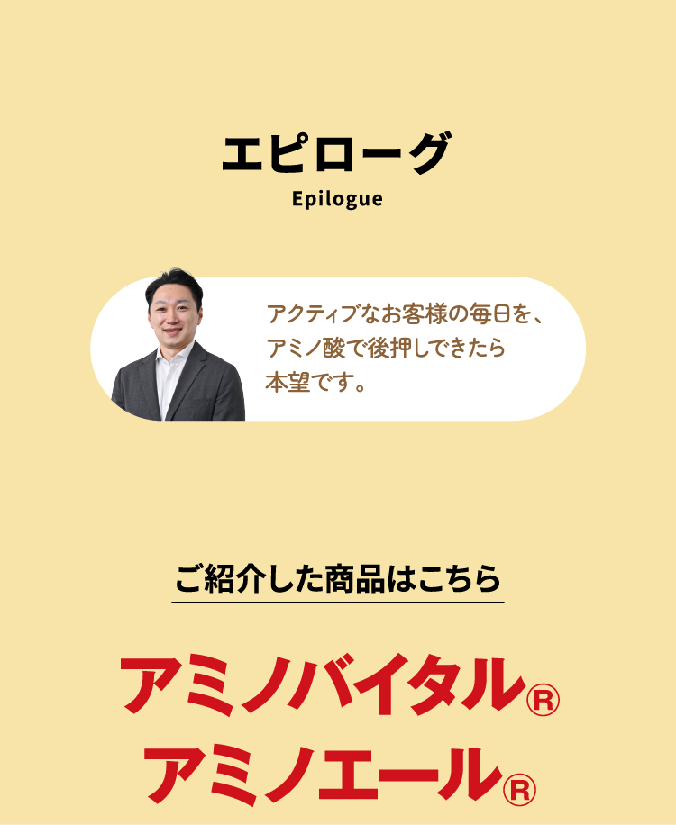 これからの時代、母のようにやりたいことをいつまでも続けたい人にこそ、筋肉づくりをサポートするたんぱく質のもとアミノ酸が役に立つのではないか。そう感じたことが、今回の商品開発への原動力になった気がします。
